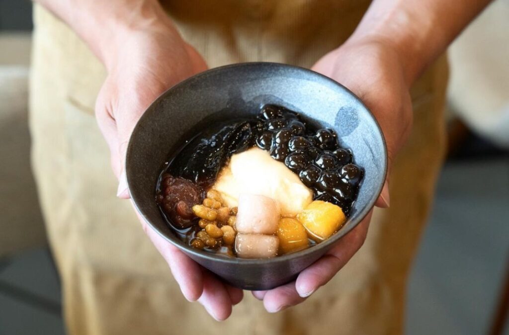 豆乳プリンの上に仙草ゼリー・あずき・ハトムギ・芋圓(ユーエン)・タピオカがトッピングされた台湾定番のスイーツ