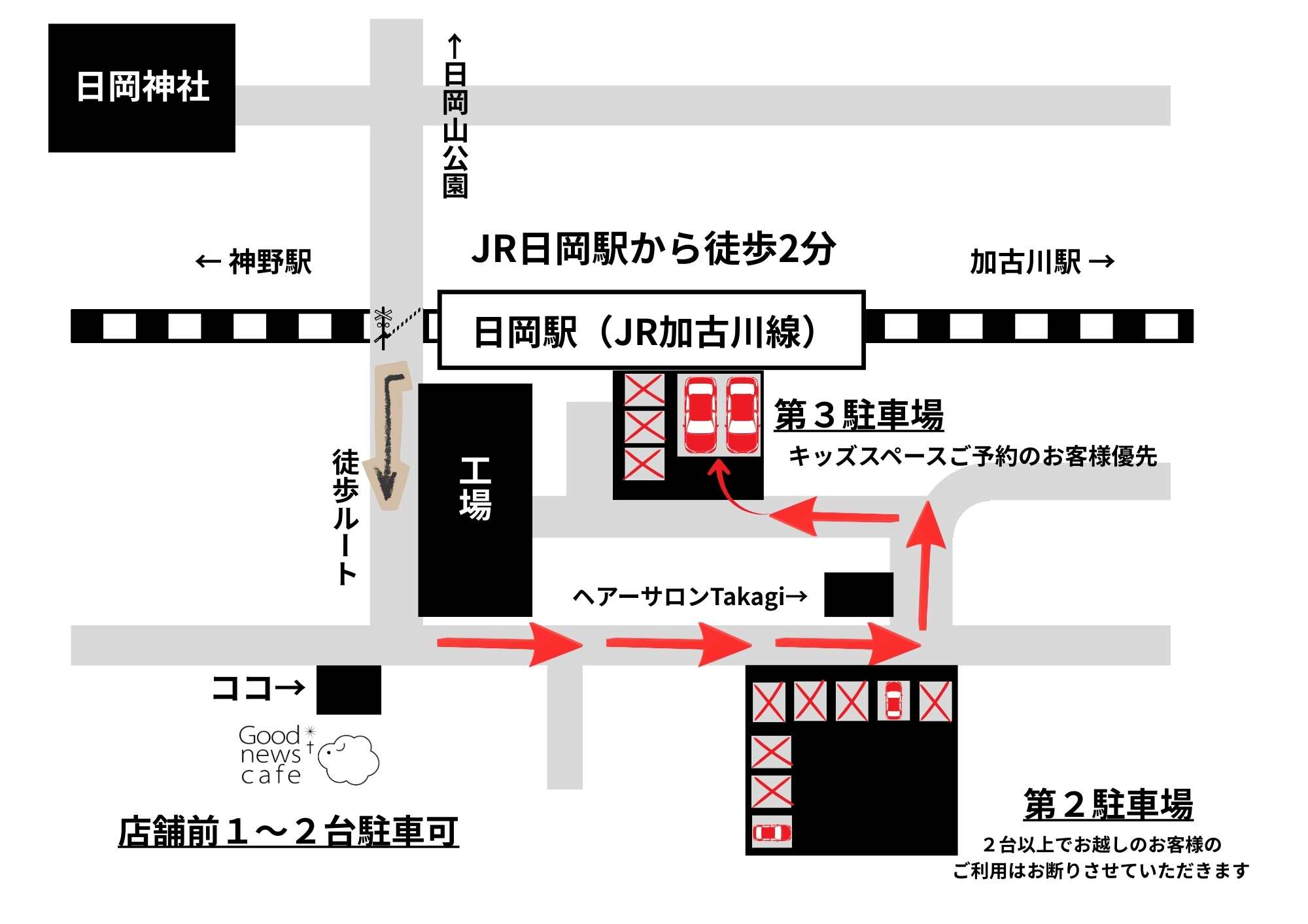 住所 兵庫県加古川市加古川町大野185-8(日岡駅徒歩2分) 営業時間 11:00〜17:00 定休日 日曜日(その他不定休あり) 駐車場 店舗前1台(軽2台可)+第二駐車場2台+第三駐車場2台 「ランチ」「カフェ」「テイクアウト」…さまざまなシーンで利用可能。